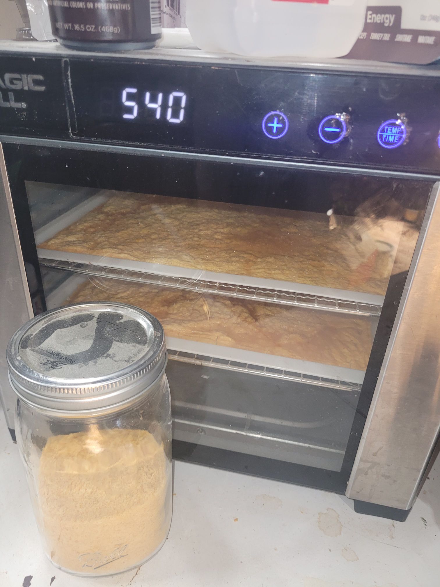 Set the dehydrator no higher than 140 degrees Fahrenheit for 12 hours. At the end of 12 hours check and make sure all the eggs are dry and crumbly. It’s ok for it to be a bit oily from the fats in the egg yolk but should not be wet or sticky at all. If any of the egg is still sticky or wet, place back into the dehydrator for additional time until all is dry and crumbly.